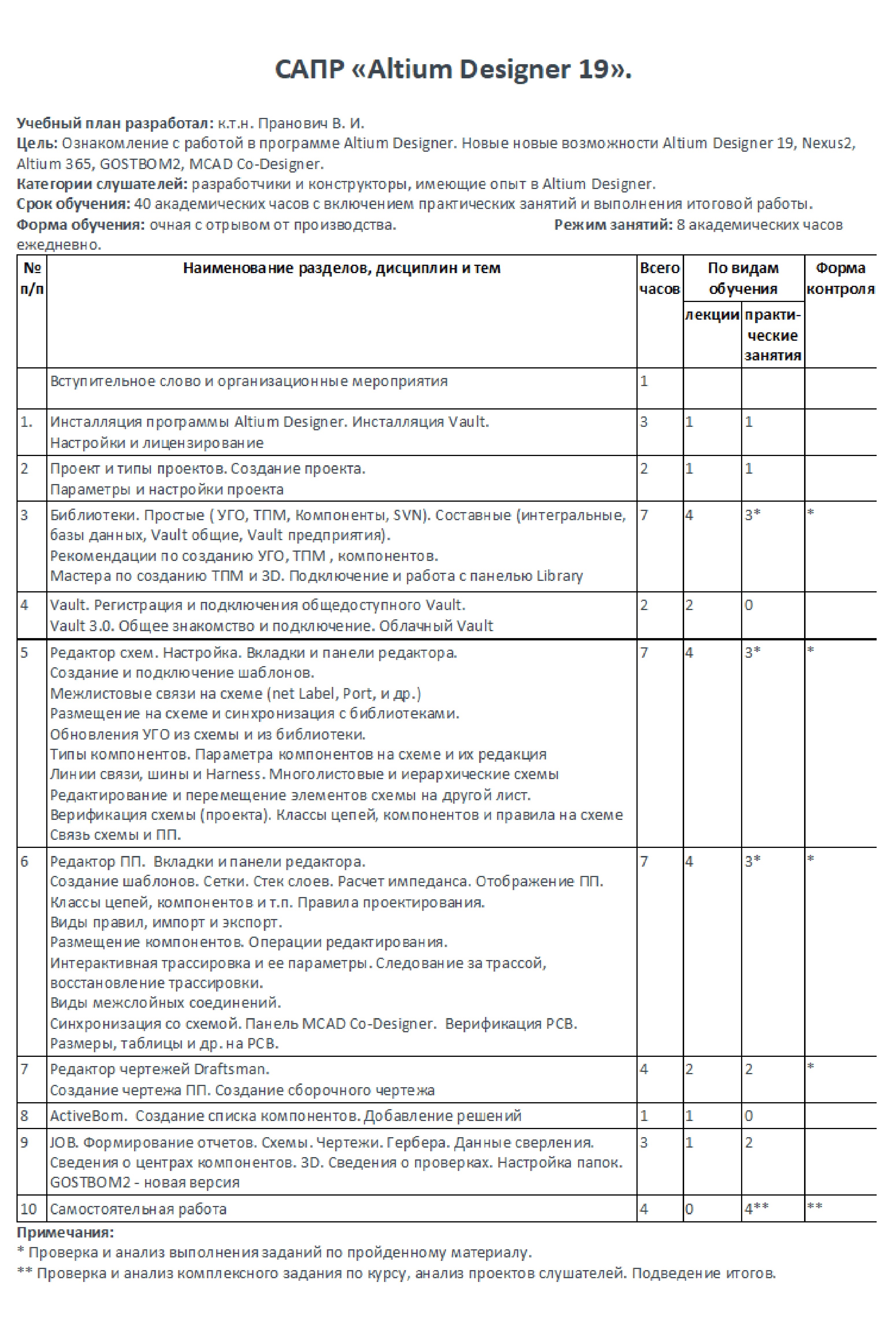 Заняття викладає Прановіч Володимир Ілліч - кандидат технічних наук, автор понад 20 авторських свідоцтв та близько 100 публікацій з тематики проектування радіоелектронних пристроїв.